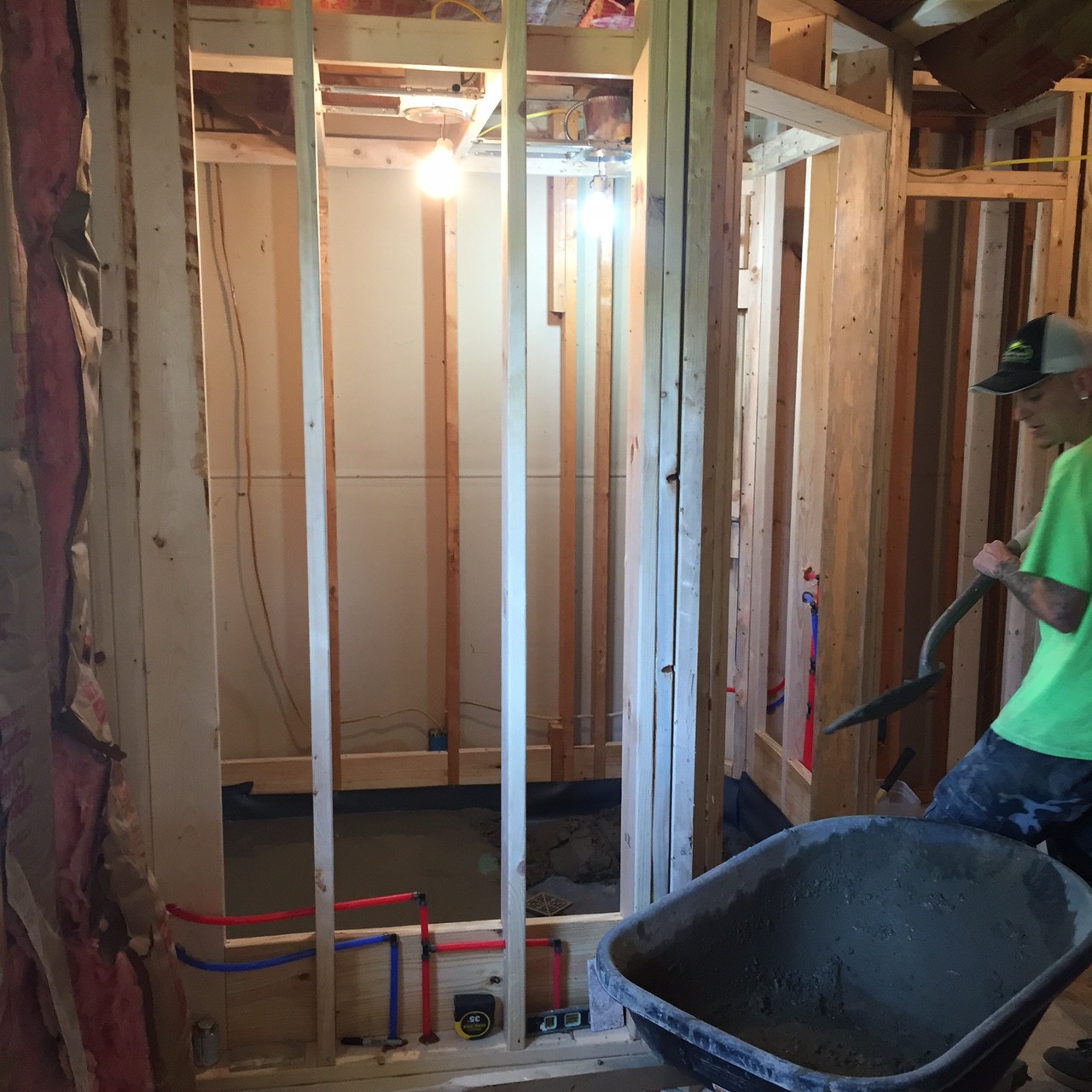 In these photos, you will see master bath framing and plumbing which includes a recirculating hot water line (from the New Nevian on Demand water heater). Also shown is the hand poured concrete sloped shower pan.