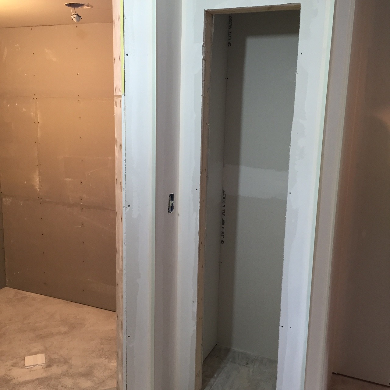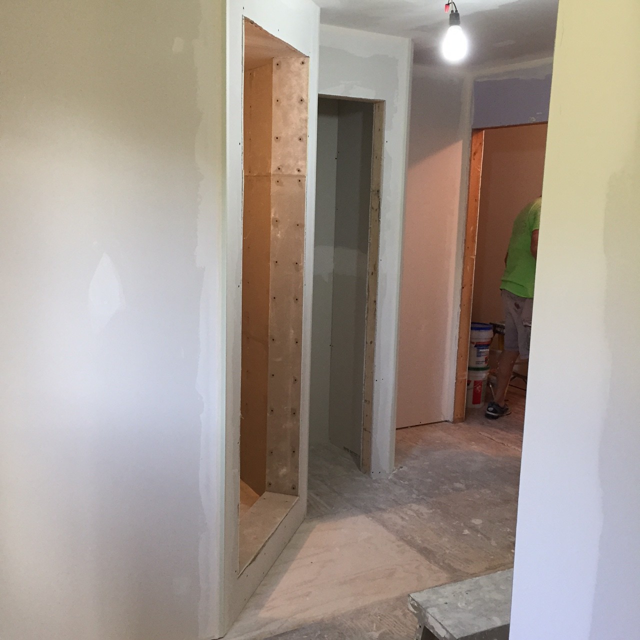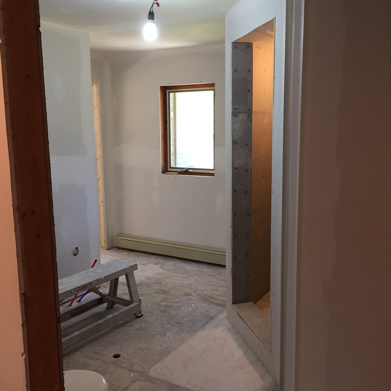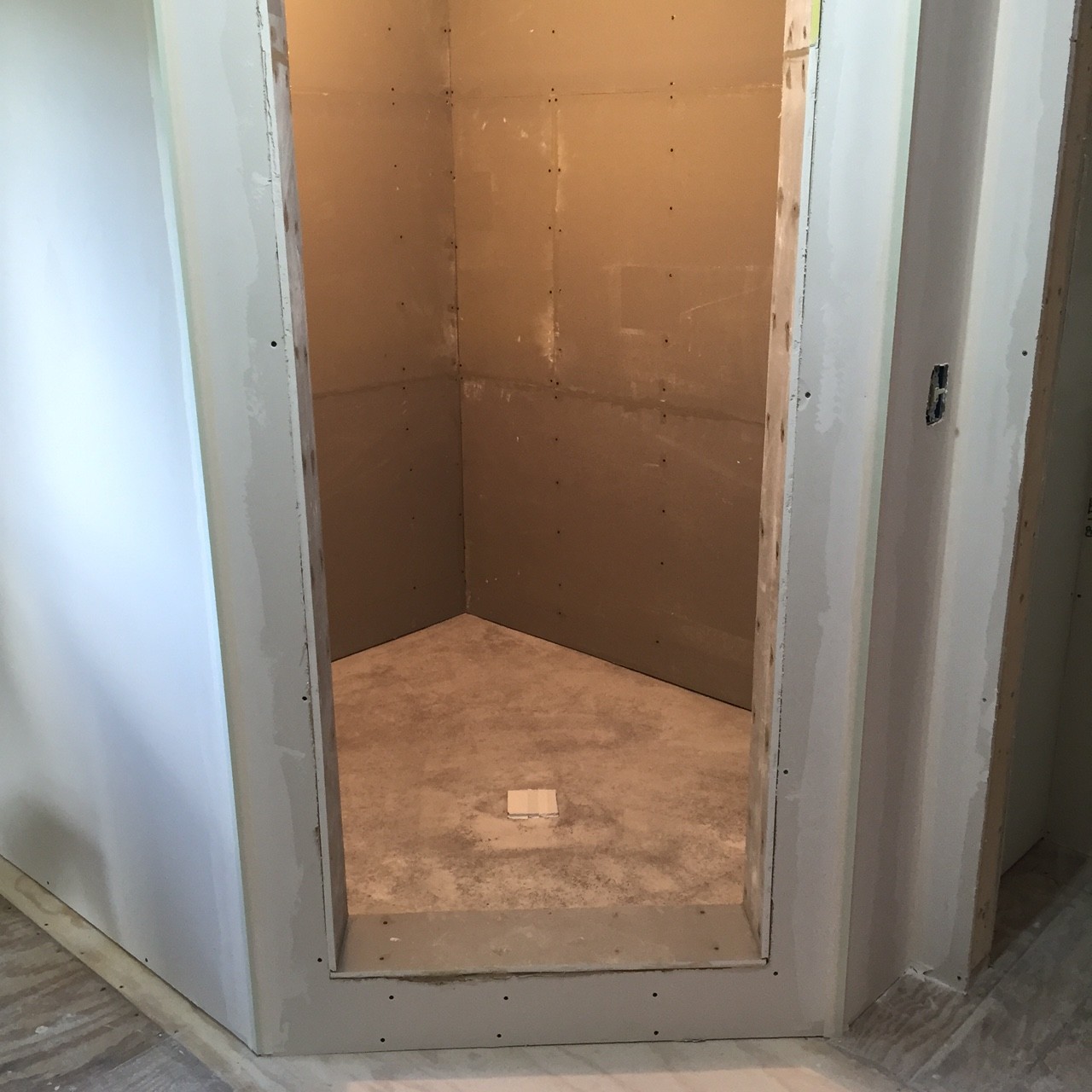 Our past week has been busy on this exciting second floor renovation project. The custom walk in plumbing is complete, the sloped concrete shower floor in place, shower walls and drywall are complete and ready for paint. Trim package is delivered and in place…ready for paint. This project is a replica of an early 19th century farm house look to include wide trims, oil rubbed bronze fixtures and pattern floor coverings.